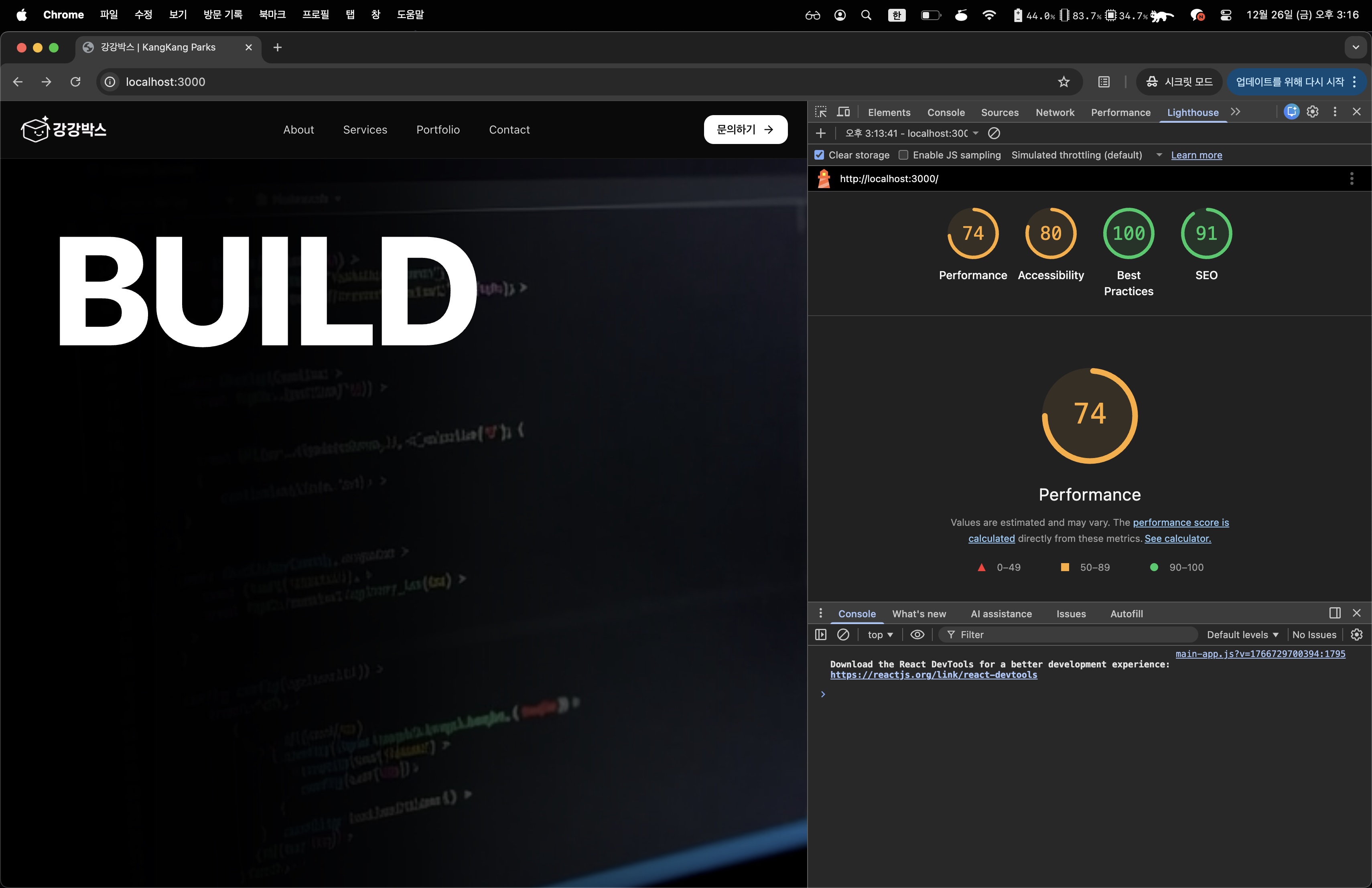 하지만 개발자의 습관은 무섭습니다. 습관처럼 열어본 Lighthouse 성능 탭에서 **74점(Orange)**이라는 경고등이 켜졌을 때, 마음 한구석이 불편해지기 시작했습니다.